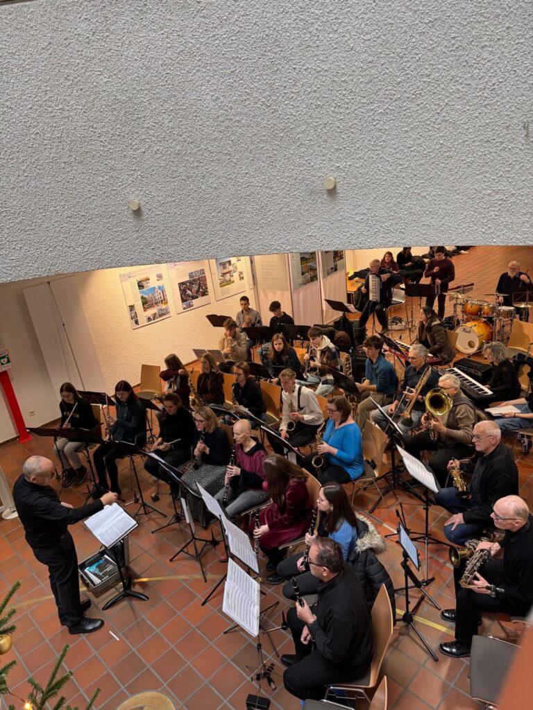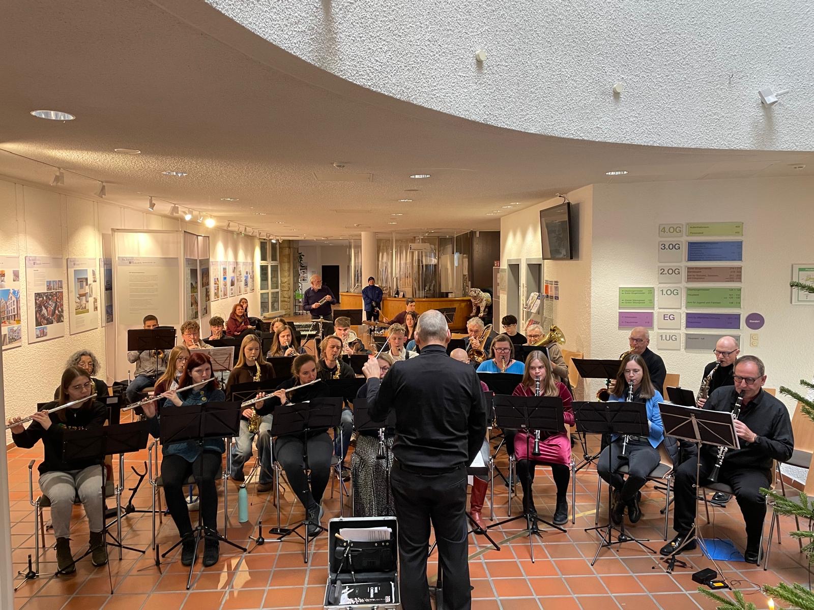 Am Nachmittag des Heiligabends spielten wir unser traditionelles Weihnachtskonzert im Foyer des Rathauses. Schon vor Konzertbeginn kamen die ersten Zuhörer. Schnell war das Gebäude gut gefüllt. Besucher verteilten sich über alle Stockwerke und nutzten die offenen Galerien, um einen guten Blick auf das Orchester zu bekommen.